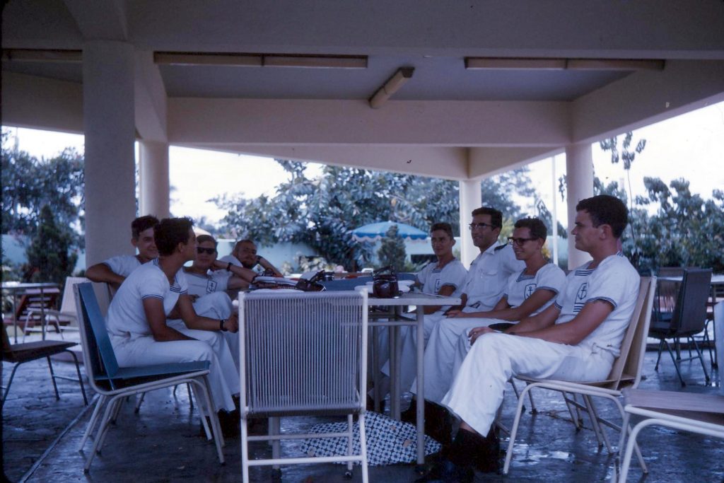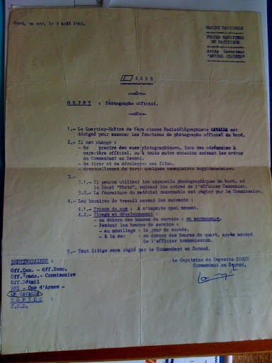 Il fallait un volontaire pour occuper la fonction de photographe du bord. Ayant un peu pratiqué la technique de développement des photos dans ma jeunesse je me suis présenté et ai été nommé. Mon rôle était d’être de toutes les réceptions du bord et de photographier les personnalités officielles ainsi que les installations portuaires avec un téléobjectif de 400 mm. Il y avait un petit labo à bord où je passais une partie de mon temps libre.