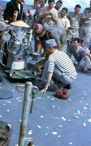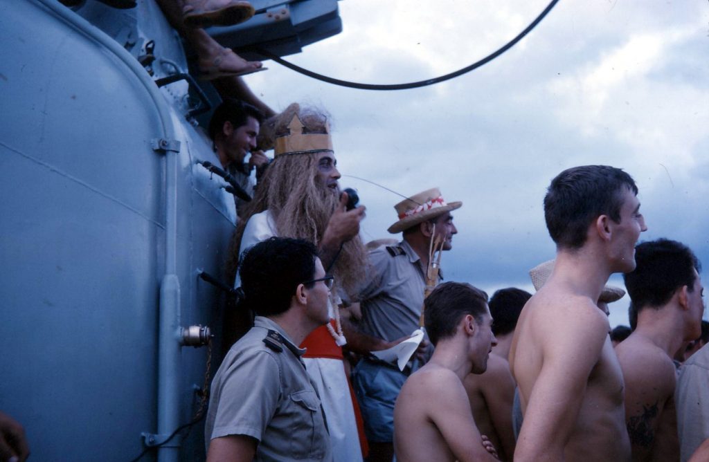 Le passage de la ligne est toujours un grand évènement à bord. Je l’avais déjà passée au moins deux fois sur le Cassard. Les « bleus » sont passés au jet, à la farine, au cirage noir. Tout cela sous l’autorité du Dieu Neptune.