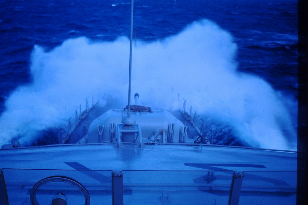 Nous avons essuyé une forte tempête, force 7 à 8, dans la mer de Chine avant d’arriver à Hong Kong le 19 décembre 1965. Nous avons embarqué de l’eau dans un poste avant, probablement une écoutille mal fermée… Avant d’arriver à quai le Pacha vient dans le PC radio me demander le nom de notre Président car c’était le 2ème tour des présidentielles, de Gaulle ayant été mis en ballotage par F. Miterrand, je lui confirme que c’était bien de Gaulle !
