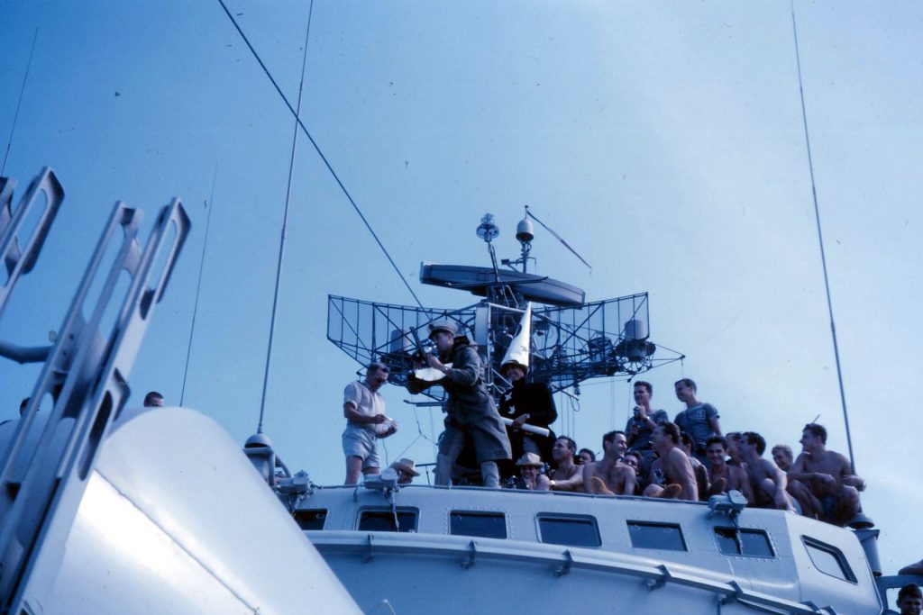 Nous avions parfois des animations à bord, il fallait bien passer le temps. Le maximum en mer a été de 23 jours…Je lisais assis sous la tourelle avant, j’apprenais l’anglais (Assimil) dans le PC radio arrière, j’aimais bien aussi jouer au poker, et je m’occupais dans le labo photos en tant que photographe du bord.