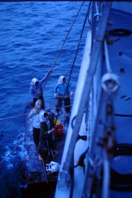 A notre arrivée à Hong Kong, après avoir essuyé notre tempête, la coque, en partie rouillée, était à repeindre. Une équipe de femmes s’en est chargée. J’étais un peu choqué de voir ces femmes, frêles, effectuer une telle tâche. Comme dans plusieurs escales les ambassades ou consulats prévenaient les ressortissants Français de la présence d’un bâtiment en escale. C’est ainsi que j’ai été invité, avec un collègue, à dîner chez le directeur de la BNCI (qui deviendra la BNP). Une limousine est venue nous chercher à bord et nous raccompagner . Je me souviens des ravissantes serveuses en tenue chinoises… Avant de regagner le bord il nous a donné quelques Dollars pour notre escale. Nous faisions très VIP…