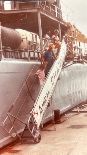 Nous devions nous retrouver… En 1981, alors que nous venions de passer Noël sous les cocotiers et que nous nous dirigions vers l’aéroport, que vois-je ? l’Amiral Charner dans le port de St Denis de la Réunion. Je me suis présenté à la coupée et nous l’avons visité avec ma famille . Oui un peu d’émotion de revoir le PC radio où j’avais passé tant d’heures, ma « banette » etc…